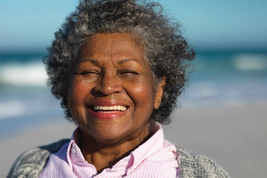 Portrait close up of a senior African American woman standing on the beach with blue sky and sea in the background, smiling to camera